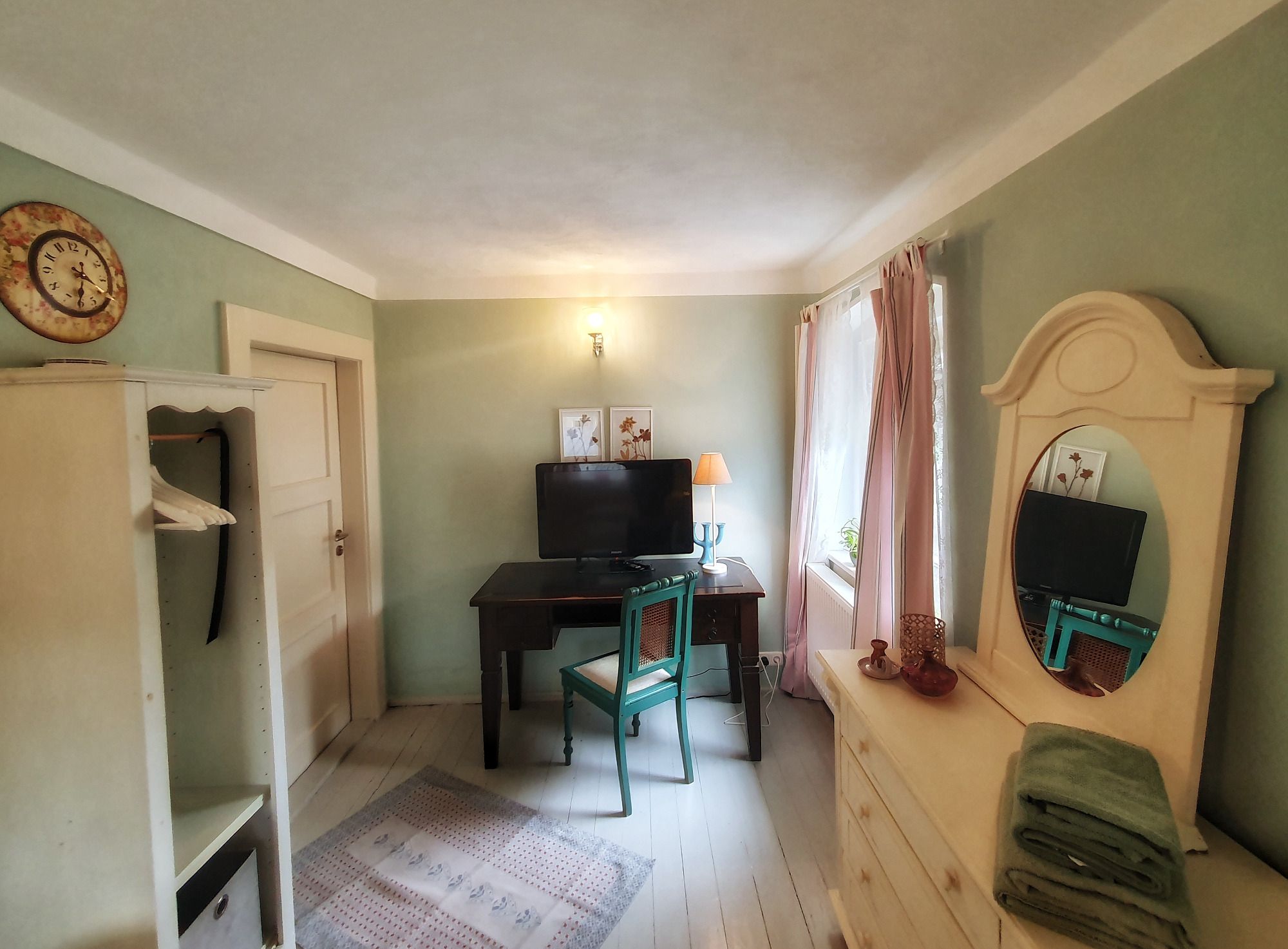 Mit Blick zur ehemaligen Kauschwitzer Mühle, ebenfalls für zwei Personen geeignet, ausgestattet mit einer Kleideraufbewahrung, Kommode und Schreibtisch.