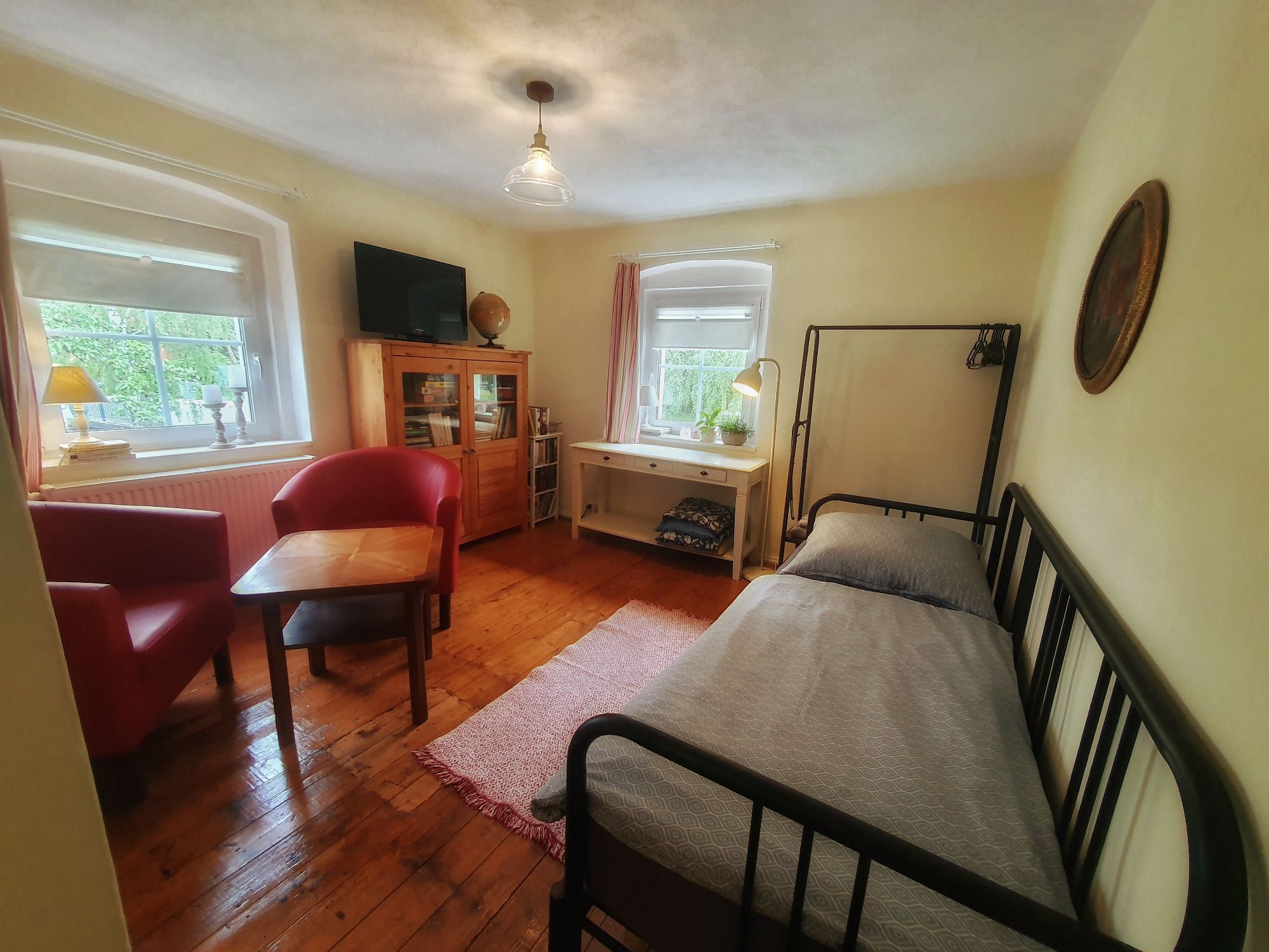 Das Zimmer verfügt über ein Tagesbett, welches sowohl als Sofa als auch ausgezogen als Bett für zwei Personen dient. Hier werden auch Bücher und Spiele aller Art für den Zeitvertreib aufbewahrt.